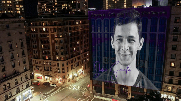 To celebrate Emerson’s 2021 Graduation Class, we would create a video projection program comprised of ~100 7-second video portraits of graduating students, morphing one into the next, and appearing next to their drawn-on signature and major.
