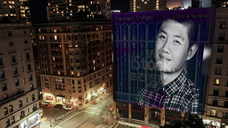 Toward the end of the program, the image will slowly zoom out revealing countless other students and coalescing into a video portrait of outgoing Emerson President Lee Pelton with a short handwritten message animating on in the same style as the student names.